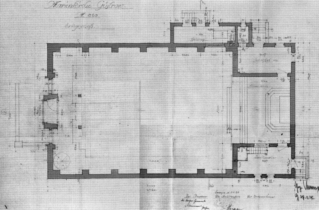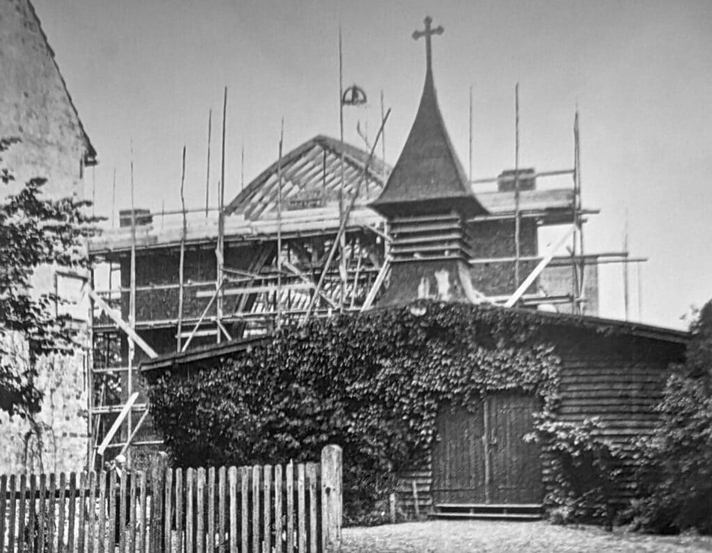Zwar gab es bereits 1914 erste Baupläne, doch war mit dem Kriegsbeginn nicht mehr an eine Ausführung zu denken. Im April 1919 wurde dann der Gottesdienstraum in der Mädchenschule gekündigt. So dass man zwischenzeitlich im Saal der Domgemeinde unterkam. Im Dezember 1919 wurde auf dem bereits vor dem Krieg gekauften Grundstück außerhalb der historischen Altstadt, in der Grünen Straße, die ehemalige Lagerkapelle des Gefangenenlagers eingeweiht.