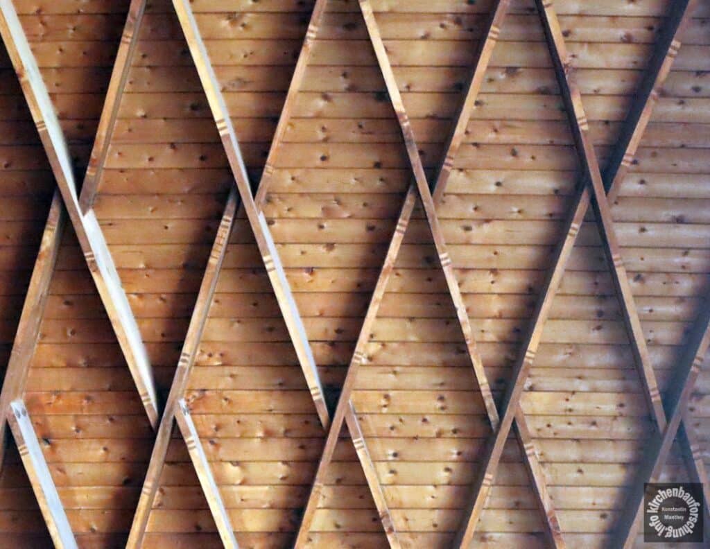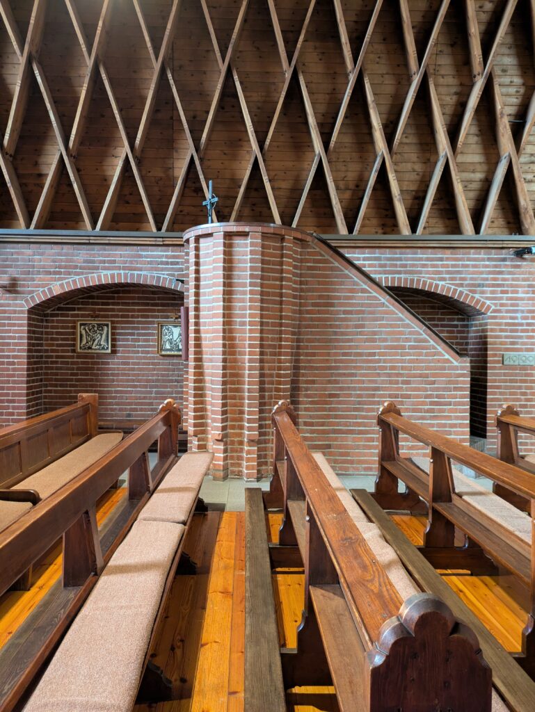 Betritt man den Innenraum gelangen Besucher durch den Windfang unter die Holzempore. Es duftet nach altem Holz. Erst mit dem Schritt zum Altar hin, entdeckt man die weite des nach Innen sichtbaren Rautennetzes des Dachs aus grob gehobelten Brettern. Eine Art gotisches Netzgewölbe überspannt den Saal und erhält durch das Südfenster ausreichend Licht. Während die Bänke in der unbelichteten Sockelzone, wie eine Art irdischer Bereich wirken.