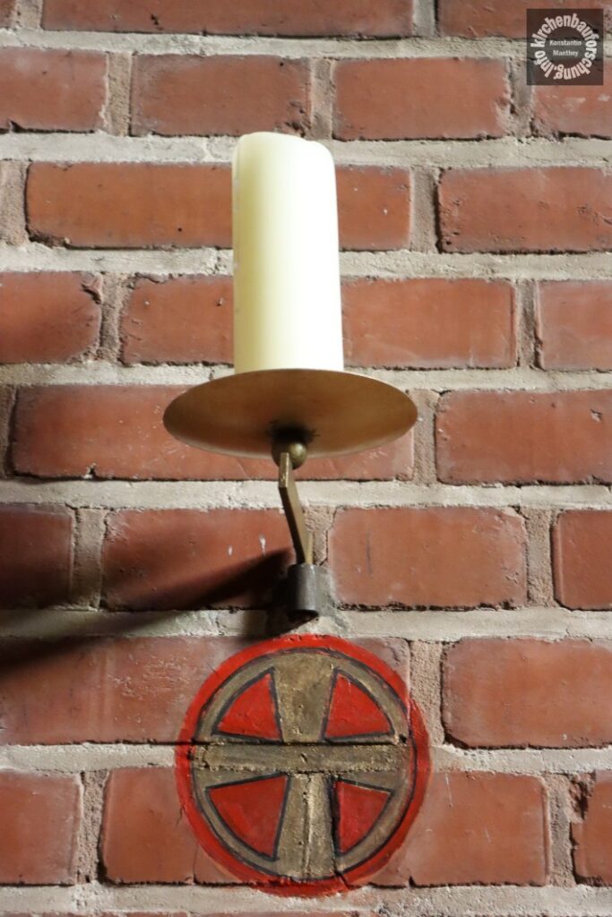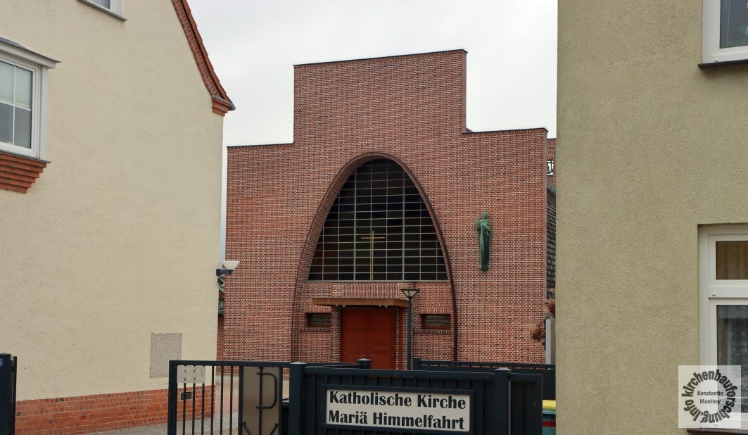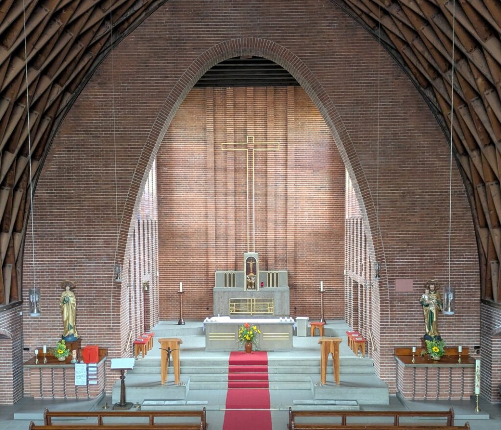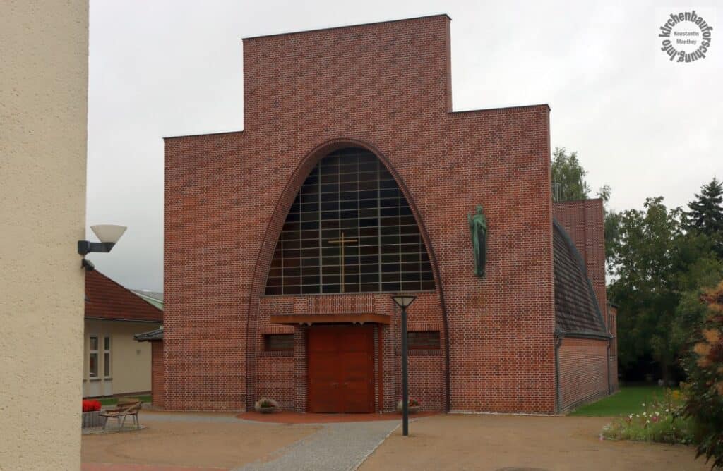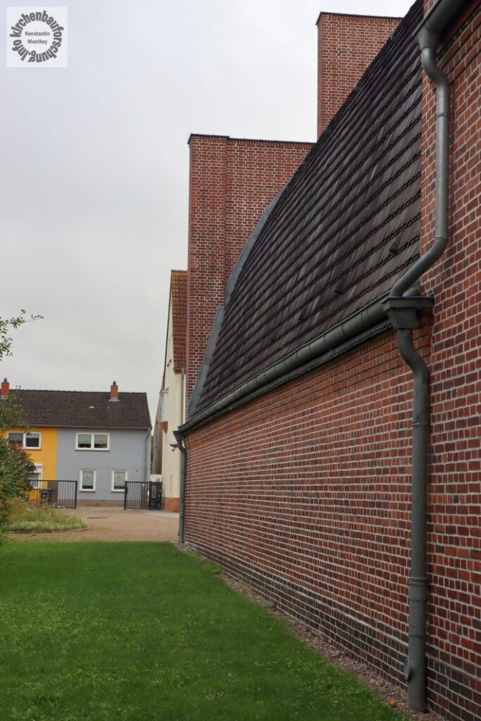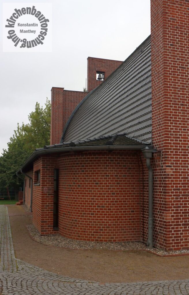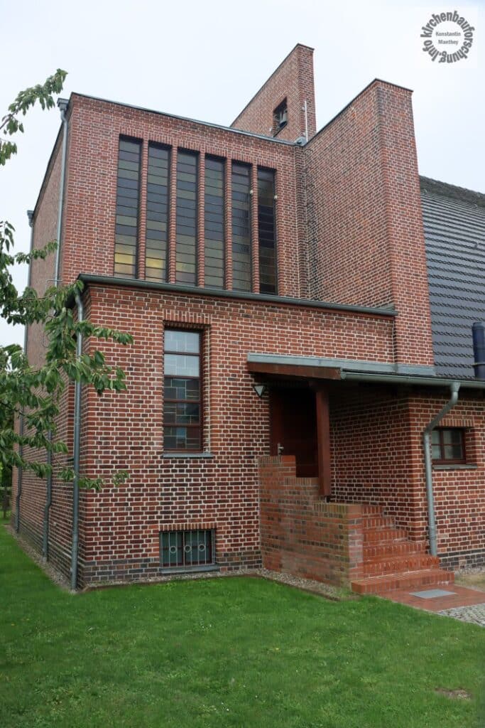 Schon bei der Annäherung durch eine typische vorstädtische Wohnstraße ist das Erste, was hinter der breiten Grundstückseinfahrt in den Blick gerät, die markante Bachsteinfassade der Kirche in zweiter Reihe. Paul Korff und Anton Berger habe dort einen expressiv-modernen Hingucker geschaffen. Zwar ohne Turm fordert der markante Stufengiebel mit seiner parabelförmigen Portalanlage den gebührenden Respekt ein.