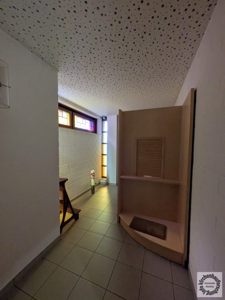 Die südliche als Fassade mit großem Fenster und Parabel gestaltet. Im Norden schließ jedoch ein eingezogener, eckiger Hochchor mit großen Fenstern, Flachdach und Balkendecke an. Die Seitenwände hingegen sind fensterlos. Im Westen gibt es nun auf ganzer Länge Anbauten. Zuletzt kam 2009 ein Beichtraum hinzu. Nur die Ostseite bietet dafür die beeindruckende Längenansicht.