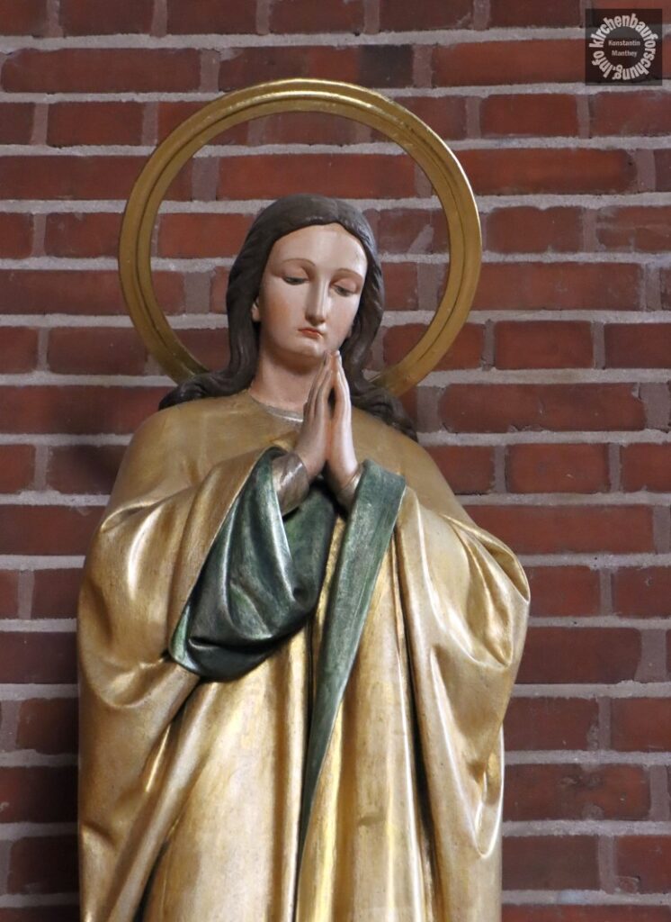 Zuerst begrüßt den Besucher außen an der Fassade eine Marienfigur. Es ist die zum Himmelfahrende Jungfrau dargestellt. Dis Galvanoplastik ist nach einem Entwurf des Osnabrücker Bildhauers Ludwig Nolde (1888-1958) 1938 an die Kirche gekommen.