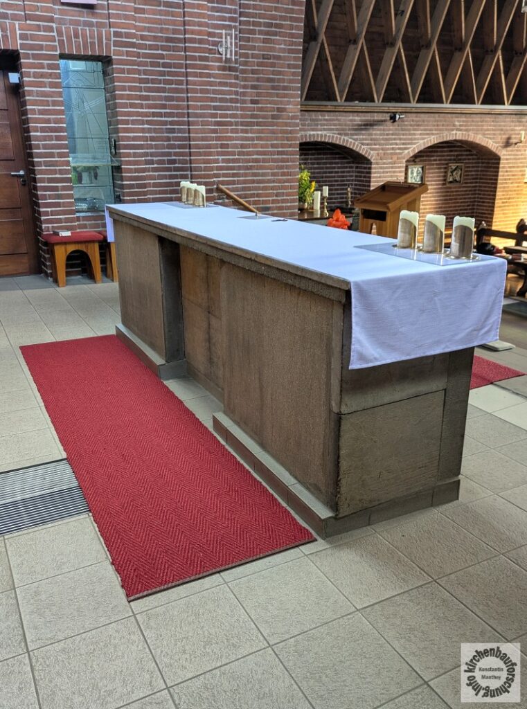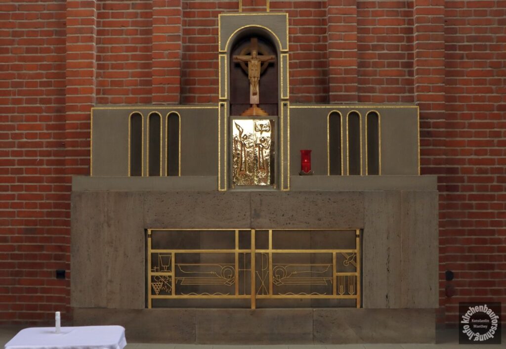 Der heutige Volksaltar ist die nach vorne versetzter Mensa des Hochaltars aus Kunststein. An der Fehlstelle der Hochaltaranlage sind die Kommunionbanktüren eingelassen. Filigrane vergoldete Gitter, die neben schwebenden Engeln eucharistische Symbole zeigen. Die Tabernakeltüren sind jedoch 1965 hinzugekommen, anstatt Alpha und Omega zeigt das Türrelief nun die Verkündigungsszene.