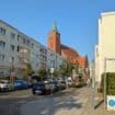Schon bei der Annäherung durch eine typische vorstädtische Wohnstraße ist das Erste, was hinter der breiten Grundstückseinfahrt in den Blick gerät, die markante Bachsteinfassade der Kirche in zweiter Reihe. Paul Korff und Anton Berger habe dort einen expressiv-modernen Hingucker geschaffen. Zwar ohne Turm fordert der markante Stufengiebel mit seiner parabelförmigen Portalanlage den gebührenden Respekt ein.