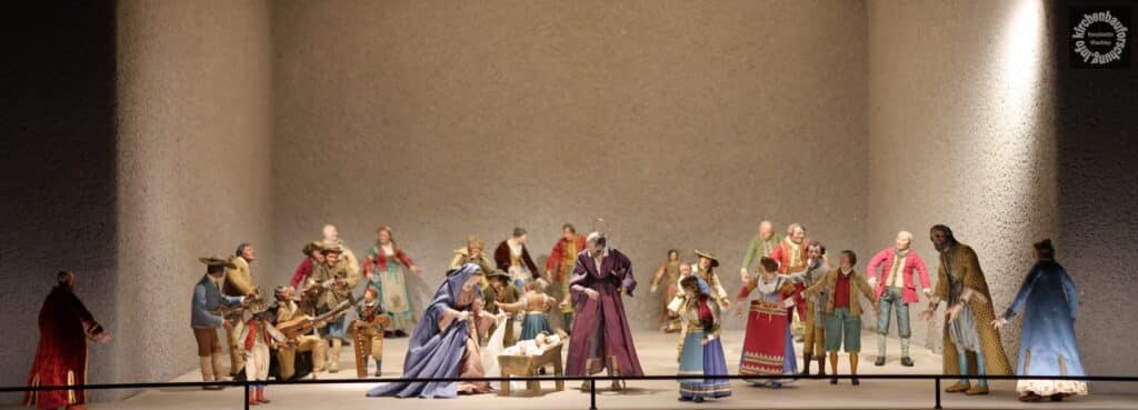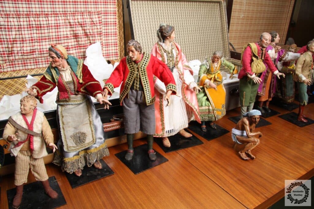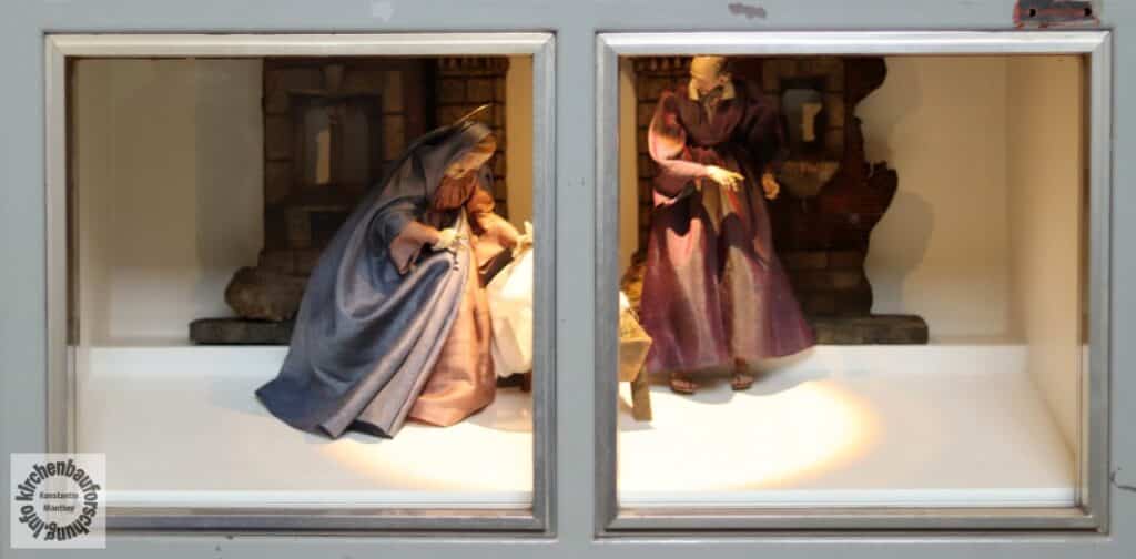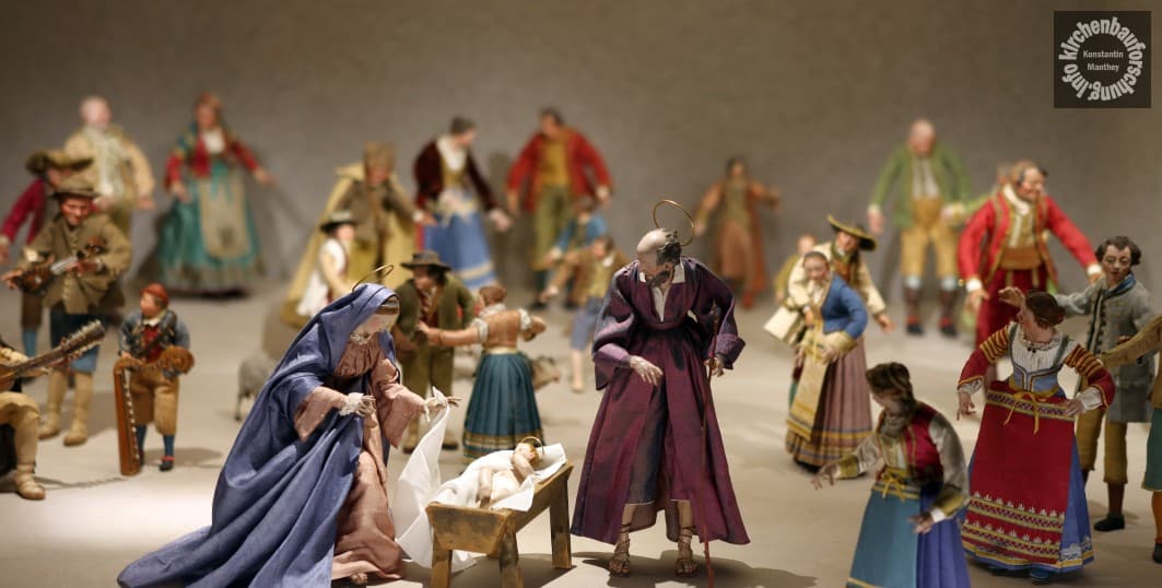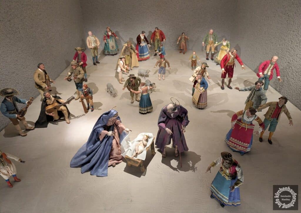 Nun stehen die neapolitanischen Figuren in kleinen Gruppen in einer Vitrine in der Weihnachtskapelle, dem ersten Raum beim Rundgang der Krypta. Zwar fehlt ihnen der historische Zusammenhand, dafür sind Sie in den Gesamtzusammenhang der erneuerten Kathedrale gestellt worden. Mehr oder wenige in einem Halbkreis umstehen mehr als 30 Persönchen die Heilige Familie. Wenn Betrachter vor die Scheibe der dezenten Vitrine treten ergänzen sie den Kreis voll. Das Kind in Windeln in einer Krippe wird zum Zentrum der Gemeinschaft – einer Communio. So wie in der Kirche, oben rund um den Altar oder in der Krypta, unten rund um den Taufstein. Durchaus ein starkes Bild.
