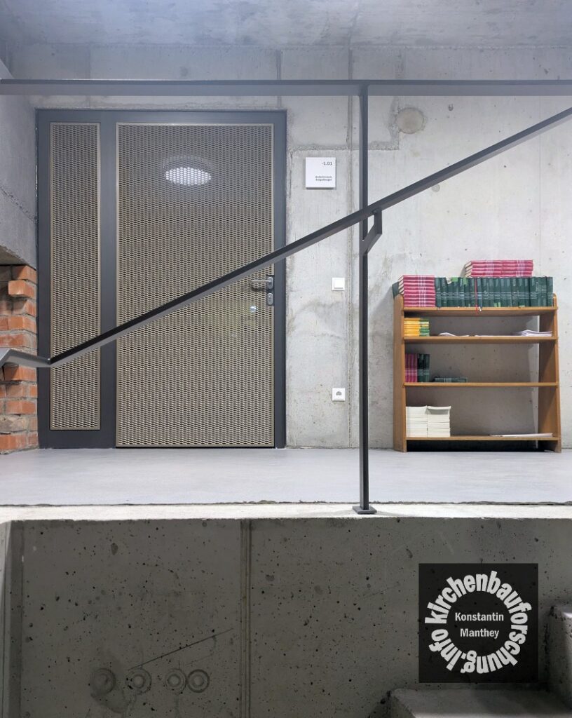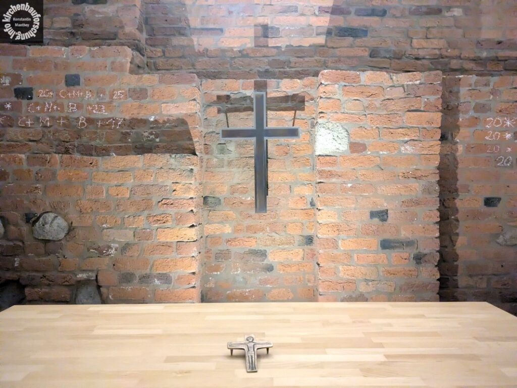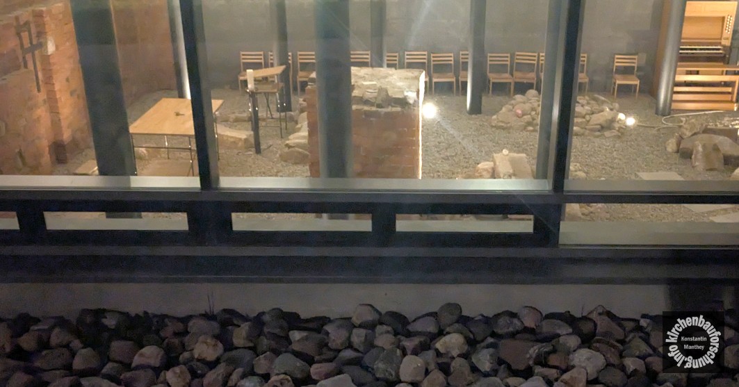 Im Kellergeschoss wird somit die Ausgrabung sichtbar gemacht. Darüber hinaus ist dies der Gebetsort im Seminarbau. Zwischen Mauer- und Bauresten wurde eine Kieselschüttung eingebracht. Weiterhin befinden sich darin verteilt typische Orte eines Sakralraumes. Der Altarbereich mit Lesepult steht hinter einer Mauerecke, als Altarwand fungiert ebenfalls eine Backsteinwand mit Kreuz. Die Orgel befindet sich an der Langseite und im hinteren Dunkel eine Christusikone. Die Stühle sind im geschütteten Boden verteilt.
