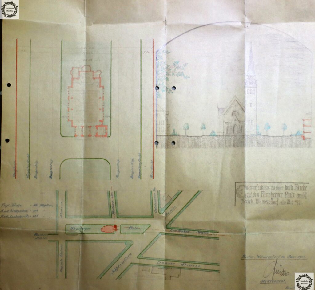 Ein neuer Fund ist in meinem Arbeitsalltag selten umso mehr freue ich mich, wenn ich Zeit in Archiven und Bibliotheken oder einfach zum Lesen meiner (Fach-)Bücher komme. Vor kurzem war ich wieder im Archiv der Grunewalder Gemeinde St. Karl Borromäus. Ich berichtete bereits kurz darüber. Dort arbeitete ich mit einem Kollegen das gut erhaltene Archiv durch. Dabei kam mir u.a. ein Plan in die Hände, der für die Berliner Kirchenbaugeschichte bemerkenswert ist. Denn er stammt aus dem Jahr 1923.