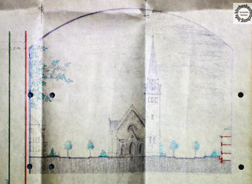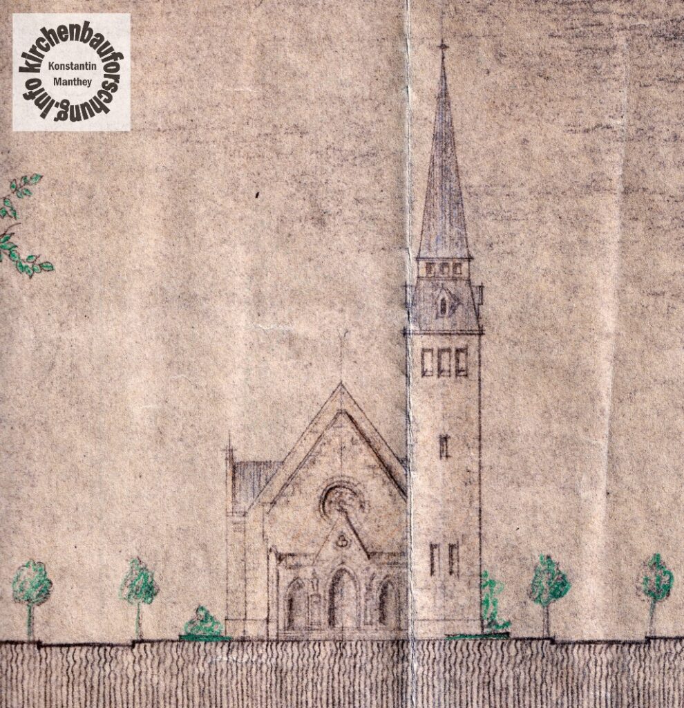 Auf den 30 m breiten Platz setzte der Entwerfer an den Rand die große Kirche mit einem etwas mehr als 20 m breitem Kirchenschiff. Hinzu kommt eine eingezogene Choranlage, die mit Nutzräumen umbaut sein sollte. Alles in allem ein interessantes Projekt, vor allem für 1923. Einer Zeit in der wenig, vor allem kaum große Kirchenbauten, entstanden.
