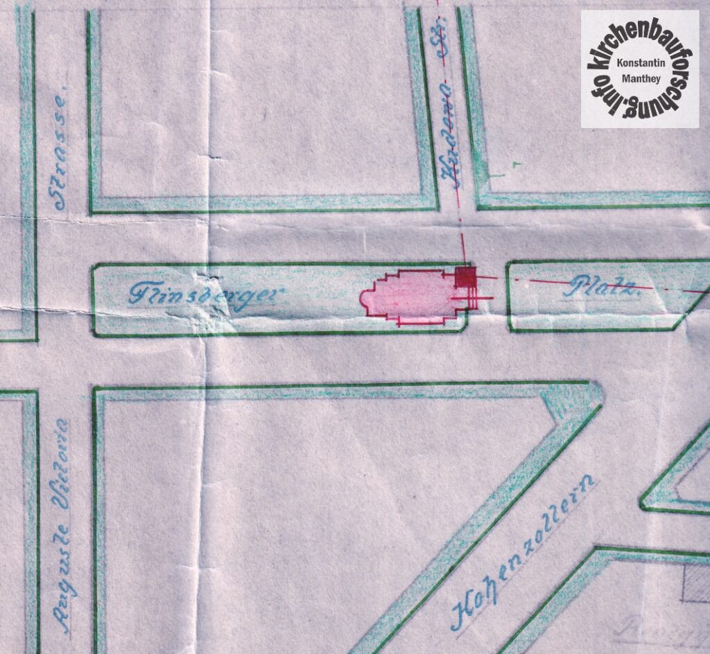 Offensichtlich wollten die Katholiken und die zuständige Pfarrei im Westen von Charlottenburg und Wilmersdorf bereits früh eine neue Kirche und neue Gemeinde errichten. Dafür gab es verschiedene Ideen bis auf dem heutigen Kirchengrundstück in der Grunewalder Delbrückstraße aus einer Villa eine erste (Not-) Kirche, St. Carolus, entstand. Zwar habe ich noch nicht alle Materialien durcharbeiten können, jedoch liegt ein Plan vor, der einen anderen Ort und eine große Kirche vorschlägt.
