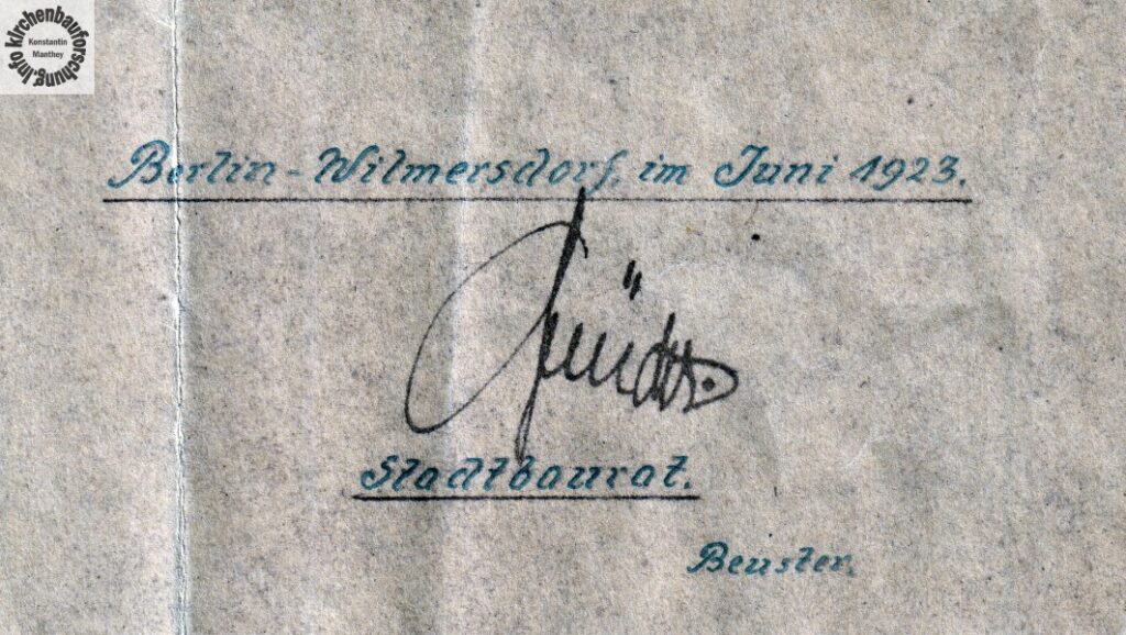 Wahrscheinlich war der Verfasser des Planes Fritz Beuster. Der bisher, übrigens, für katholische Projekte nicht bekannt ist. Es handelt sich hierbei um den ehemaligen Wilmersdorfer Stadtbaurat, Jahrgang 1876. Dieser behielt trotz der Bildung Groß-Berlins, 1920, anscheinend seinen Titel bei. Natürlich könnte die Unterschrift aufgrund der Umlaut-Striche auch für einen anderen Namen stehen, doch die Position und das Fehlen einer anderen Signatur bzw. einer weiteren Namensangabe in Reinschrift, stärken meine Vermutung.