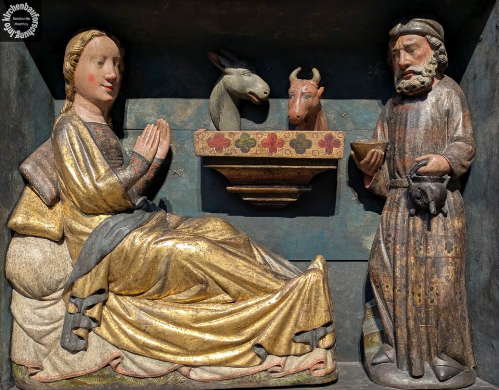 Das besondere an der Szenerie ist, dass das Kind weg ist. Jesus ist nicht im Bild. Offensichtlich ist es über die Jahrhunderte verloren gegangen. Doch für mich hat es auch eine andere Seite. Was wäre Weihnachten ohne Kind? Es wäre schrecklich. Nur, dass wir es den Figuren des Hauptaltarschreins nicht ansehen. Denn die Zuwendung Mariens scheint etwas zu gelten, dass sie zwischen den Händen hält – ihr Kind. Für den Betrachter eine interessante Szenerie. Für die Akteure ist das Kind da. Und wir sehen es nicht mehr. Darauf kann sich ein eigener Reim gemacht werden.