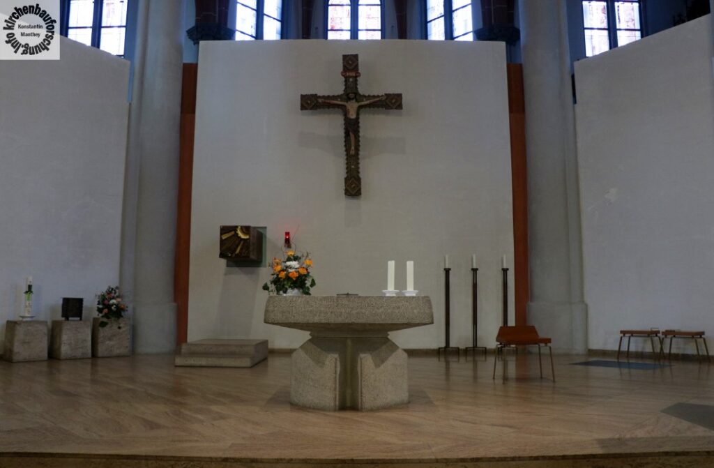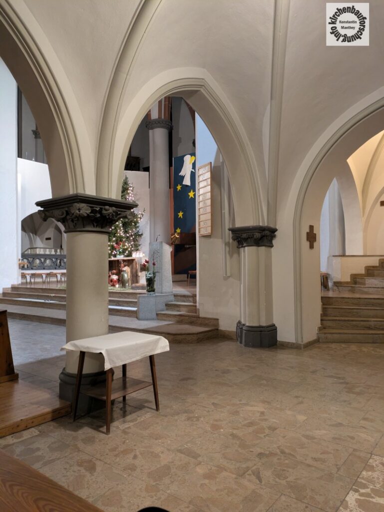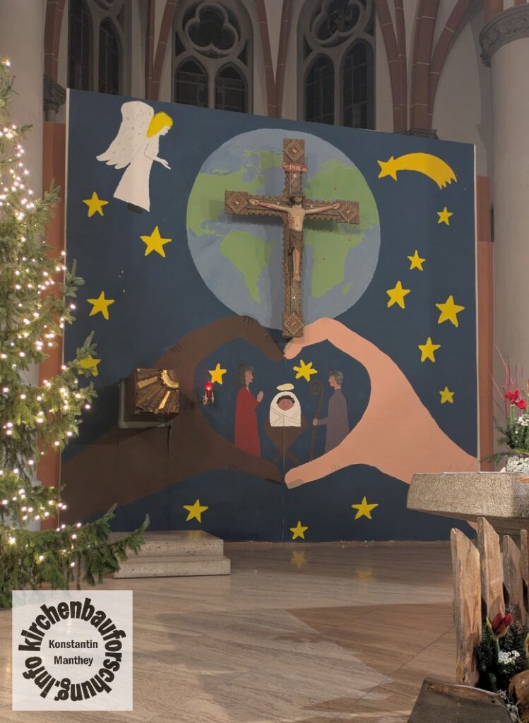 Doch da war noch etwas. Ein Bild, dass ich zuvor zwar schon einige Weihnachten gesehen aber nicht bedacht habe. In unserer Pfarrkirche, St. Josef, Berlin-Weißensee von Moritz & Welz (1899), gibt es alljährlich eine Weihnachtskulisse, welche die Altarwand, der ab 1972 durch Hans Wachter umgestalteten Kirche, vollkommen bedeckt. Dieser Hintergrund bezieht die Hauptstücke Tabernakel und Kreuz mehr oder weniger mit ein und ist traditionell von der Jugend der Gemeinde gestaltet. Seit wann genau, dass weiß ich nicht. Gesehen habe ich es jedoch öfter. Aufmerksam wurde ich überhaupt nur, da ich von meinem Platz den großen, blonden Engel sah und endlich der Geistliche sich für das Wandbild bedankte.