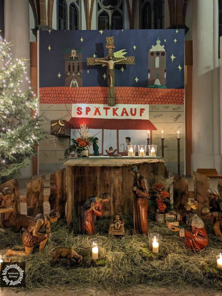 Unter dem zentral angebrachten Kreuz, dessen Hintergrund eine Weltkugel bildet, schließen sich zwei Hände, eine dunkel, eine hell, zu einem Herzen zusammen. Dieses umgibt die Heilige Familie. In das Herz ist die Ewiglichtlampe eingebunden. Rechts oben der Weihnachtsstern als Sternschnuppe, links oben der besagte Engel. Das Thema heißt wohl: Gitte kommt in die Welt für alle Menschen. Es ist eine Arbeit aus Karton und Papier in raumfüllender Größe. Einfach und klar. Vor zwei Jahren war die Krippe ein Spätkauf in Weißensee, unter zwei Kirchtürmen, der eine wohl der von St. Josef, der andere der Turm der ehemaligen Bethanienkirche auf dem Mirbachplatz, einer Ruine die nun zu Wohnraum umgebaut wird, unweit der katholischen Kirche.