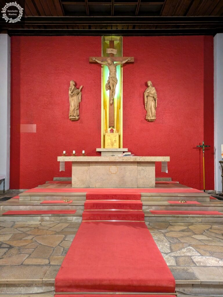 Weiterhin befindet sich ein Kreuzweg von Rudolf Heltzel (1907-2005) im Kirchenschiff. Es ist die typische Umsetzung und Technik Heltzels, mir erscheint es auf den ersten Blick größer und präsenter als andere seiner Kreuzwegumsetzungen. Nicht ganz rekonstruiert ist bisher der Weg der Kreuzigungsgruppe, welche nach 1975 die Chorwand ziert. Zunächst waren Maria, Jesus am Kreuz und Johannes, also das typische Triumphkreuzprogramm vor hellem grün angebracht. Mittlerweile ist es ein sattes rot.