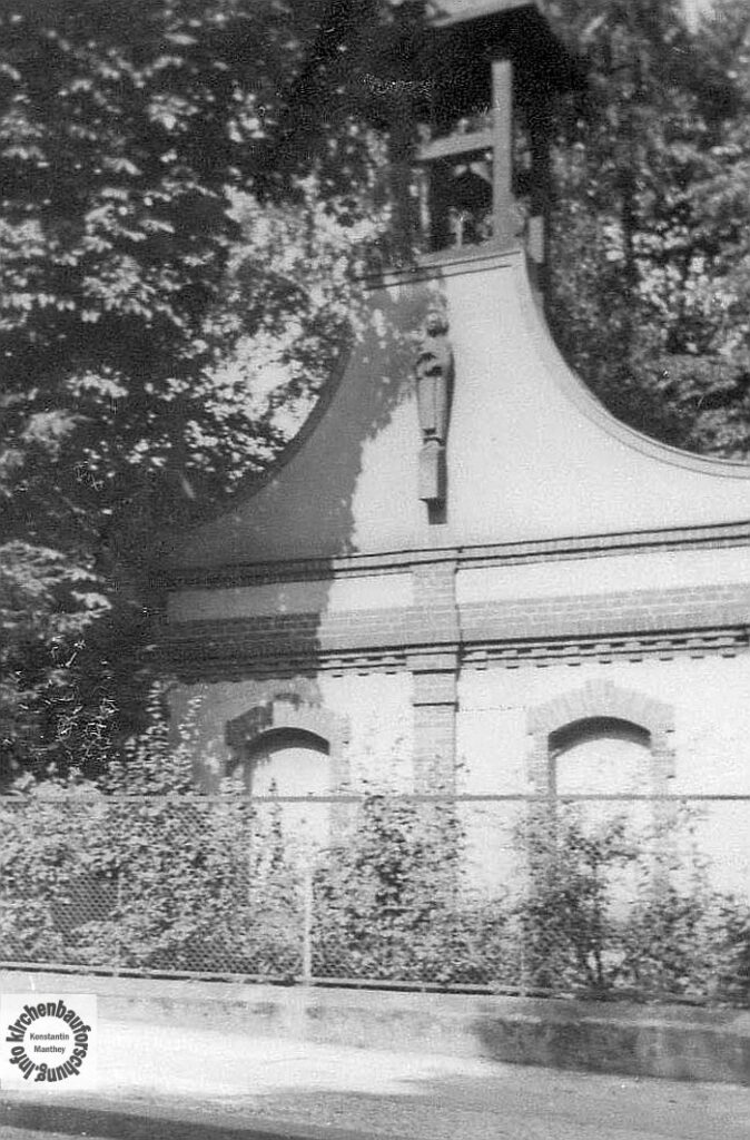 Es gab keinen Turm, dafür war die Glocke in einem hochgezogenen Giebel., Weiterhin wurde eine Johannesskulptur von Josef Dorls (1869-1945) aus Kunststein am Giebel angebracht. Er war in diesen Jahren ein wichtiger Bildhauer für die Katholiken in der Region. Mehr zu Dorls erfahren Sie hier auf den Seiten von Norbert Seyer (ext.). Die Figur des Patrons ist erhalten geblieben, ebenso wie eine Kreuzwegstation von Dorls. Beide sind heute außen über der Sakristeitür zu sehen.