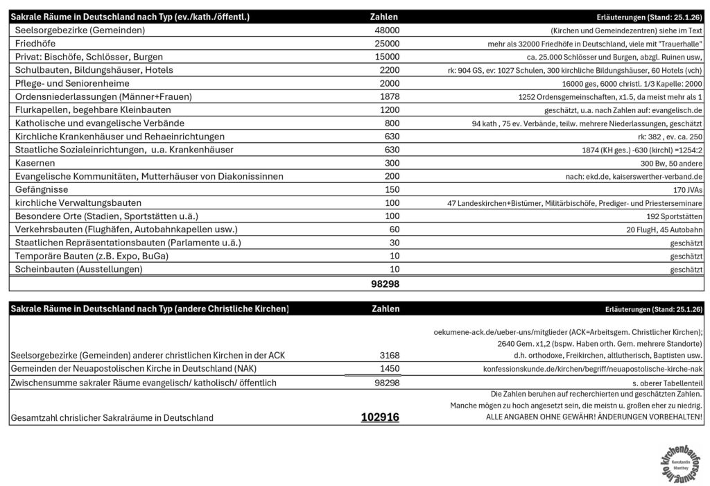 Schätzung der Zahl christlicher Sakralräume in Deutschland, Stand: 25.1.2026