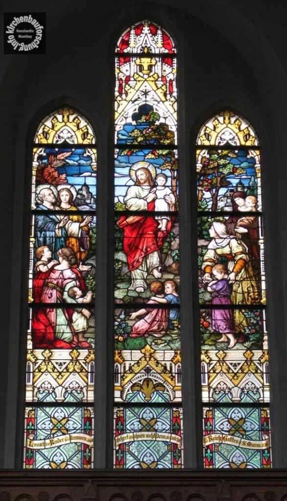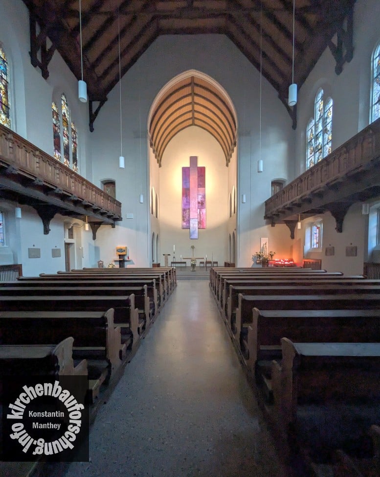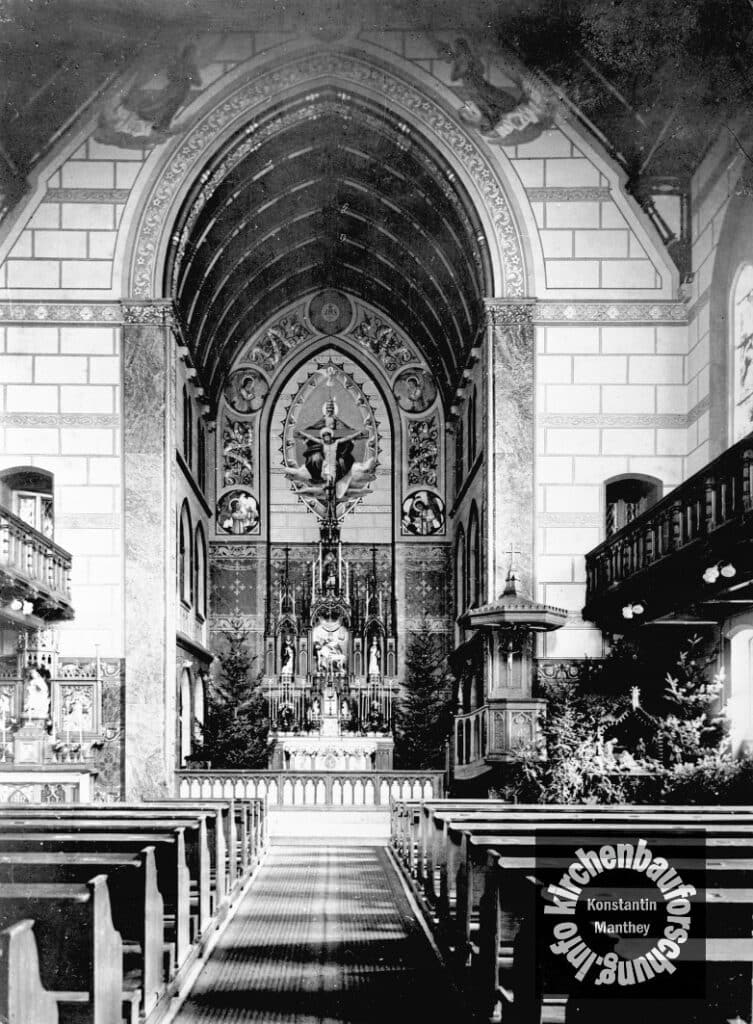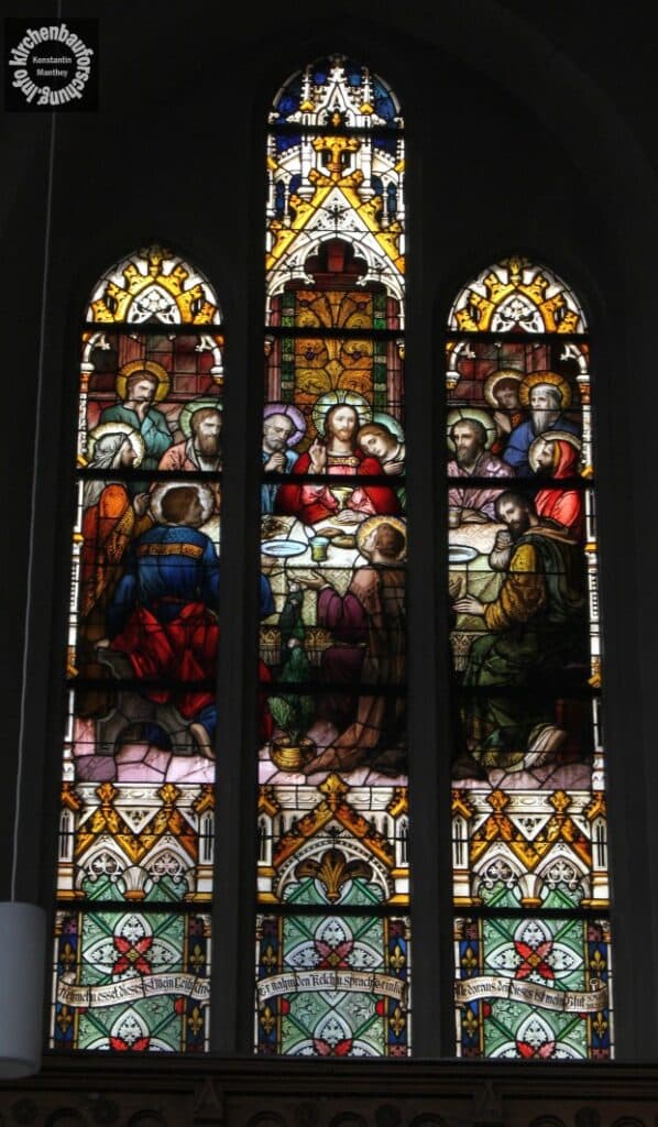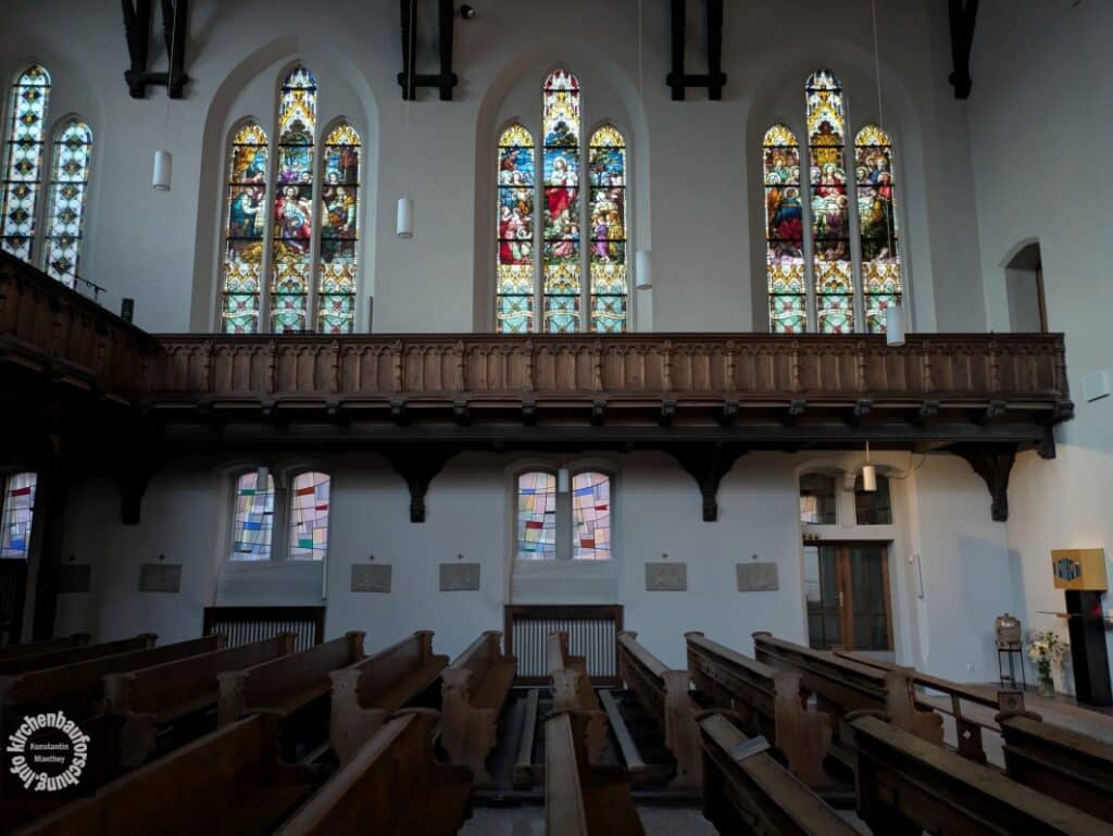 Somit kam es zu einer einschiffigen Halle mit einem hohem eingezogenem Chor und einer holzverschalter Tonnendecke. Umlaufende Holzemporen mit neugotischer Maßwerkbrüstung erhöhten die Kapazität der Kirche. Zwar ist von der Ausstattung der Erbauungszeit mit Ausnahme der meisten Fenster nichts weiter erhalten. Die hingegen sind diese sehr qualitätsvoll. Sie stammen von der Mayer’schen königlichen Hofkunstanstalt in München, einem großen Manufakturbetrieb. Die Themen der drei großen Fensterwerke im Nordosten (linke Wand) sind: Jesus beim Gastmahl in Bethanien, Christus als Kinderfreund und das letzte Abendmahl.