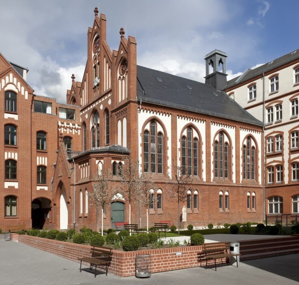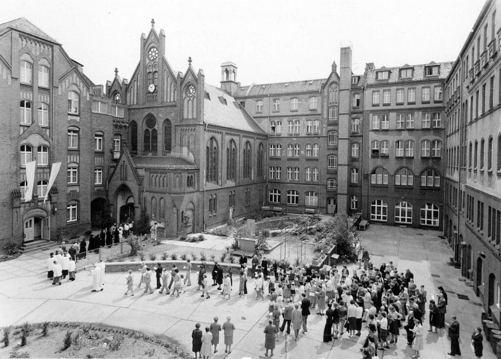 Ein anderes bekanntes Beispiel waren die Karmelitinnen vom Göttlichen Herzen Jesu (DCJ) im Prenzlauer Berg. Dort gründete Anna Maria Tauscher, ihr „Heim für Heimatlose“, 1891, für hilfsbedürftige und arme Kinder in der Pappelallee 61. Später gründete sie mit ihren Mitstreiterinnen einen Orden. Darüber hinaus war die Notkirche der erste Ort der Gemeinde Heilige Familie. Bis 2024 waren übrigens noch Schwester vor Ort. Nun ist das lukrative Objekt verkauft, an einen mir unbekannten Investor, für kirchliche Akteure kam das zentral gelegene Ensemble mit Ausbaureserven nicht in Frage. Die Arenberger Dominikanerinnen der Hl. Katharina von Siena betrieben übrigens in Berlin 1938, acht Einrichtungen. Darunter ein weiteres großes Haus an St. Elisabeth in Berlin-Schöneberg mit Heimbetrieb oder das große Krankenhaus in Berlin Mitte, mit der Kirche Maria-Viktoria, die bereits 1938 geschlossen werden musste. Somit gehörten die Nonnen zu einem der großen Anbieter auf katholischen Gebiet, hinter den Grauen Schwestern der hl. Elisabeth (22 Einrichtungen) und den Marienschwester (20 Einrichtungen, 1938).