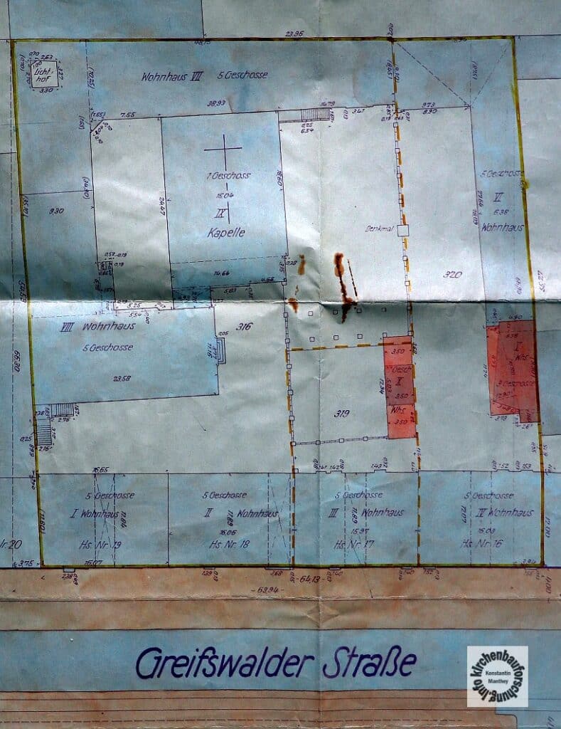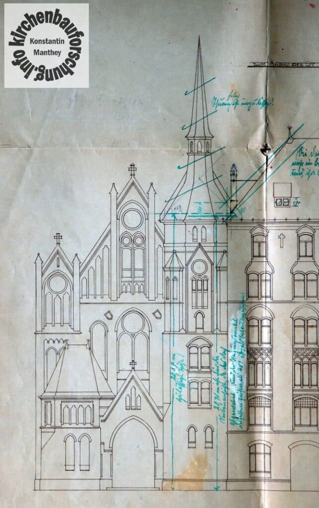 Zurück zur Greifswalder Straße dort wuchs der Bedarf und die Anlage 1896 konnte die Backsteinkirche in neugotischen Formen nach Plänen des Berliner Kirchenarchitekten August Menken (1858-1903) errichtet werden. In seinen 45 Lebensjahren hatte sein Büro bereits sehr viele Sakralbauprojekte realisiert. Auffällig ist, dass Menken für beide großen christlichen Kirchen arbeitete, keine Selbstverständlichkeit in den Nachwehen des Kulturkampfes, wo konfessionelle Streitigkeiten an der Tagesordnung waren. Als Berliner Beispiele seien hier die evangelische Erlöserkirche am Nöldnerplatz oder auch die Mitarbeit an der evangelischen Auferstehungskirche an der Friedenstraße genannt. Hinzu kommen etliche katholische Projekte, wie St. Johannes in der Hasenheide, St. Clara Neukölln oder die Kirche im Katharinenstift, Mater dolorosa.