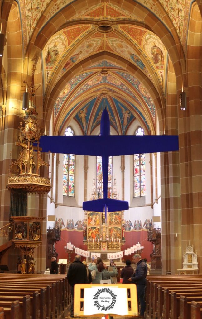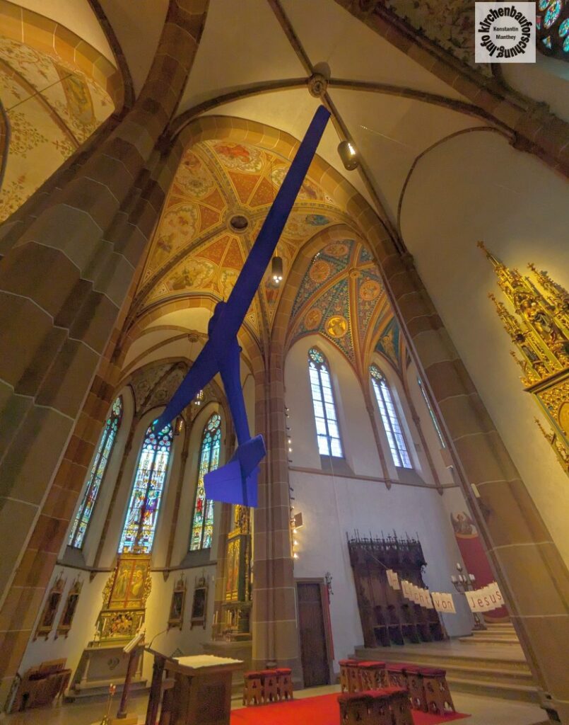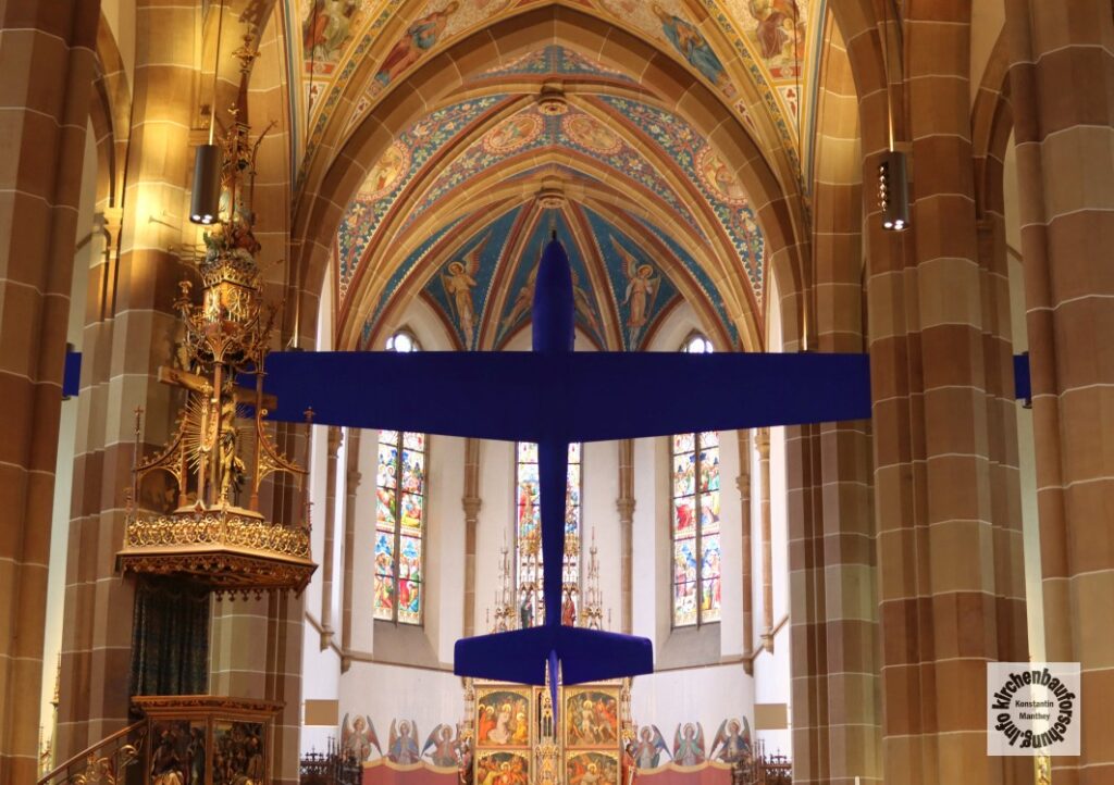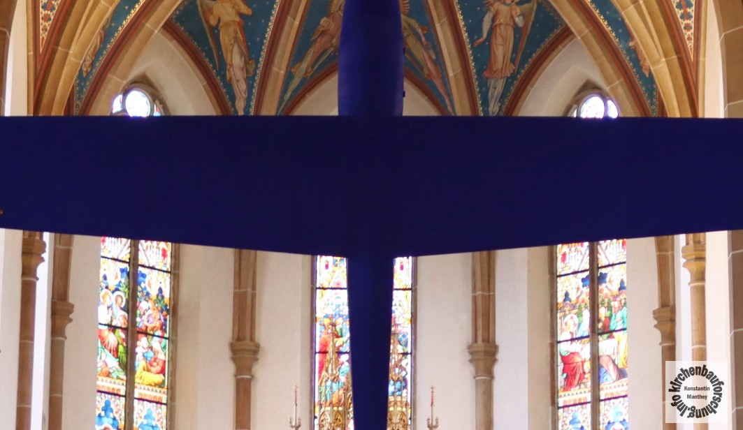 Jetzt einen Tag später bin ich sehr fasziniert wie sehr sich dieses starkblaue Objekt „weggeschaut“ oder vielleicht auch einpasst. Da hängt ein riesiges Fluggerät in der Vierung einer neugotischen Sakralarchitektur und trotzdem bleibt die Kirche irgendwie ungestört und in ihrer Pracht unbeeindruckt. Ein völlig anderer Körper durchbricht eine riesige Kirche und passt dadurch hinein. PLANETARES BLAU ist wirklich eine besondere Zugabe einfühlsam – trotz oder gerade wegen der Größe.