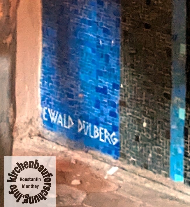 Weder ist bekannt, wie es zu Dülberg kam, er war als Professor bis 1931 in Kassel und Weimar im Staatsdienst. Doch da das Werk links unten mit seinem und rechts mit dem Namen der Werkstatt Puhl, Wagner und Heinersdorff beschriftet ist, ist Ewald Dülberg eindeutig als Künstler der Totengedenkens von Bernau zu identifizieren. Die Entstehungszeit ist auf zwischen 1919 und 33 einzugrenzen, da in dem letzten Jahr der Künstler stirbt. Wahrscheinlich ist sogar 1926-33, denn oft kam das künstlerische Gedenken erst ab Mitte der 1920er Jahre in die Kirchen. Vielleicht kam der Künstler erst nach seiner Zeit als Kunstprofessor, also nach 1931 und über die Berliner Mosaikwerkstätten zu dem Auftrag. Diesen Fragen werde ich weiter nachgehen.