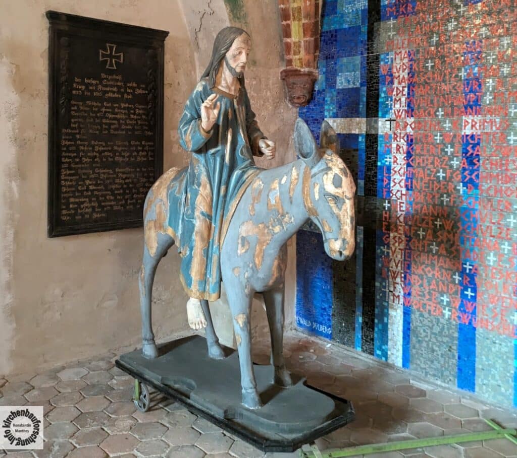 Die Marienkirche in der Hussitenstadt Bernau zählt zu den besterhaltenen Stadtkirchen der Mark Brandenburg, reichhaltige Ausstattung vom Mittelalter bis heute neben dem berühmten dreifach wandelbaren reich ausgeschmückten Hochaltar aus der Zeit um 1515, gibt es Wandmalerei und Skulptur des Spätmittelalters. Darüber hinaus Totenkronen und anders Ausstattung aus den evangelischen Jahrhunderten sowie mindestens ein Kunstwerk des Expressionismus – dazu später noch mehr. Darunter eine für den Norddeutschen Raum seltene Holzfigur auf Rädern, einen Jesus auf einem Esel. Diese Prozessionswagen sind vor allem für den süddeutschen Raum bekannt.