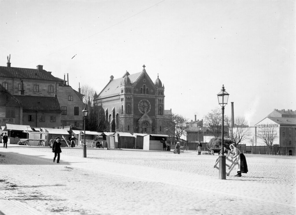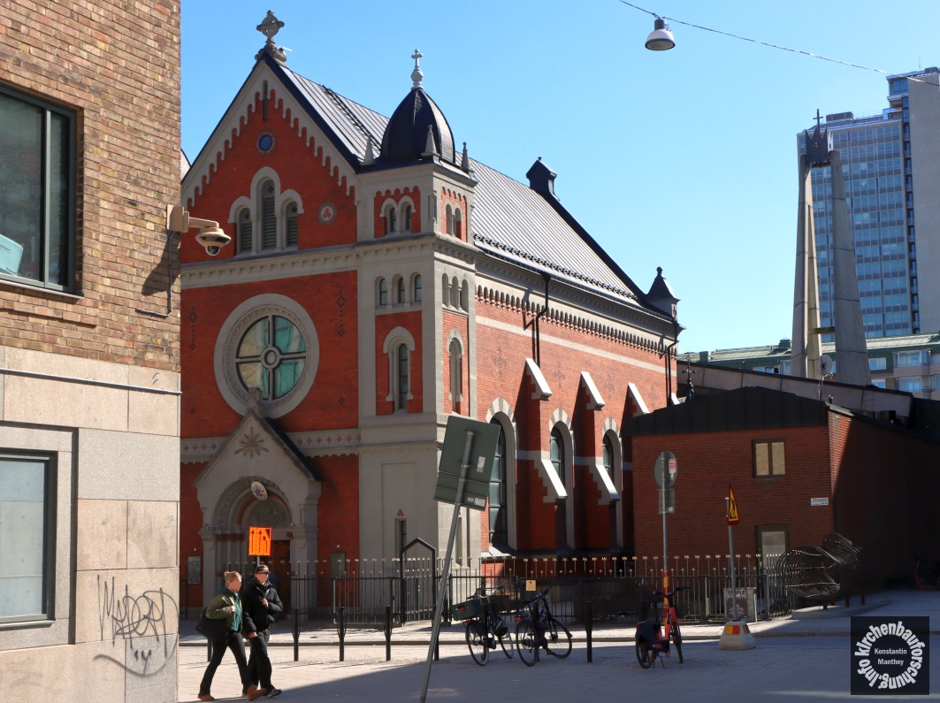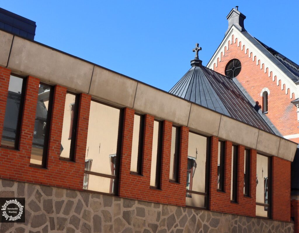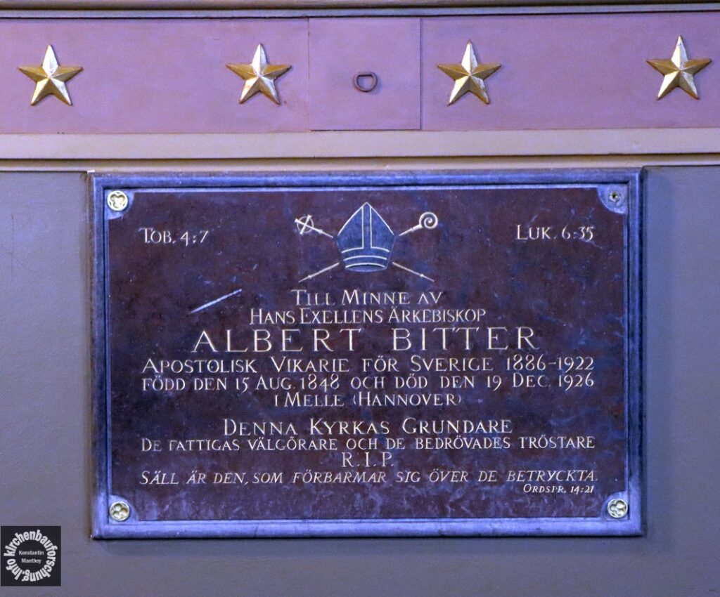 Zunächst entsteht also im heutigen Kreativstadtteil eine neue Kirche. Der Bau wirkt auf den Aufnahmen sehr würdevoll und eher groß. Jedoch ist der historistische Sakralraum klein und passt somit ganz zur nordischen Diaspora. Er weist zudem nur zwei angedeutete Türme auf, die den Portalgiebel flankieren. Da Turmbauten teuer waren, wurde an dieser Stelle gespart. Vergleichbares kennen wir aus dem deutschen Diasporakirchenbau. Als Architekt ist ein A. Gillberg zu finden, leider ist dazu nicht mehr bekannt. Bauherr war der Apostolische Vikar in Schweden und Norwegen, Albert Bitter (1848-1926), der zum Titularbischof von Doliche ernannt war und 1893 auch geweiht wurde.