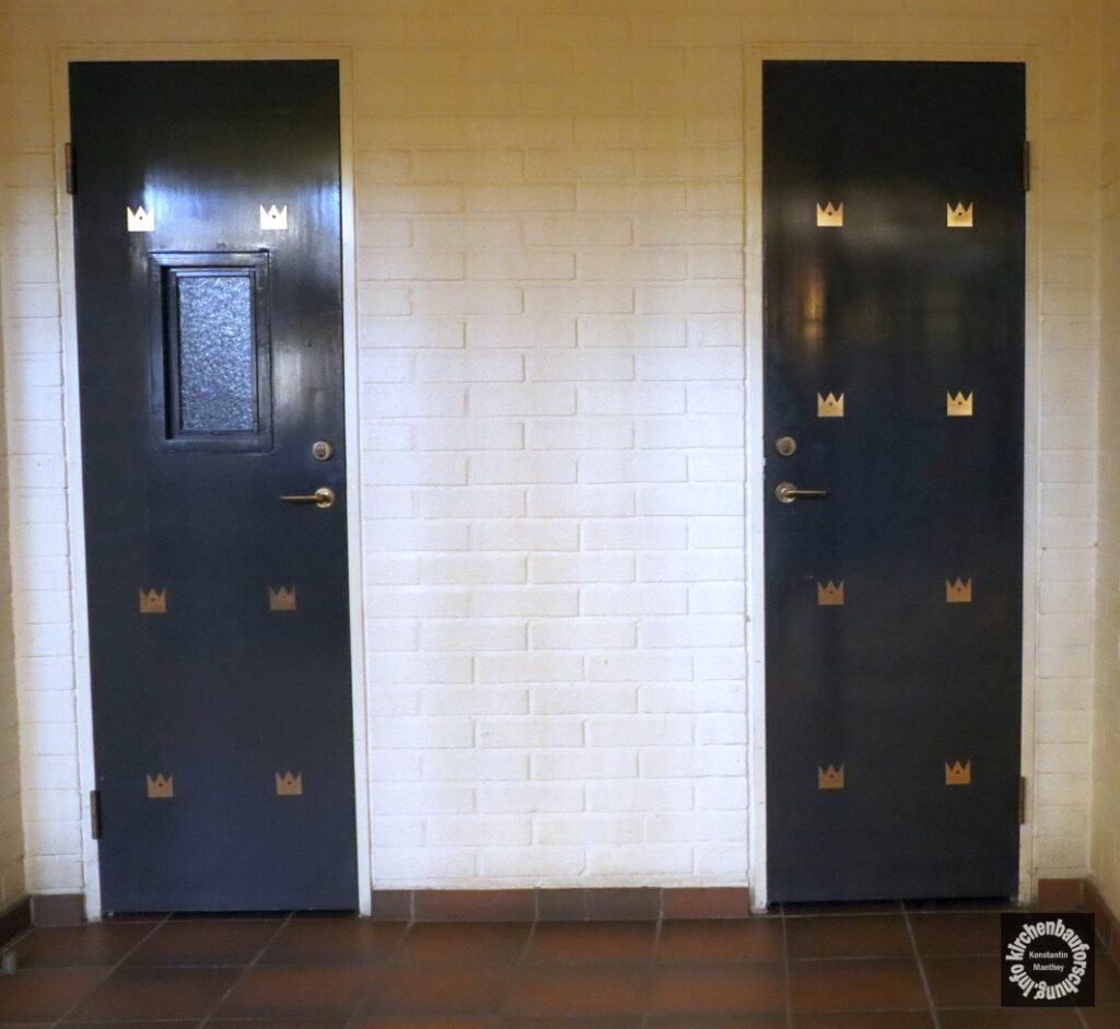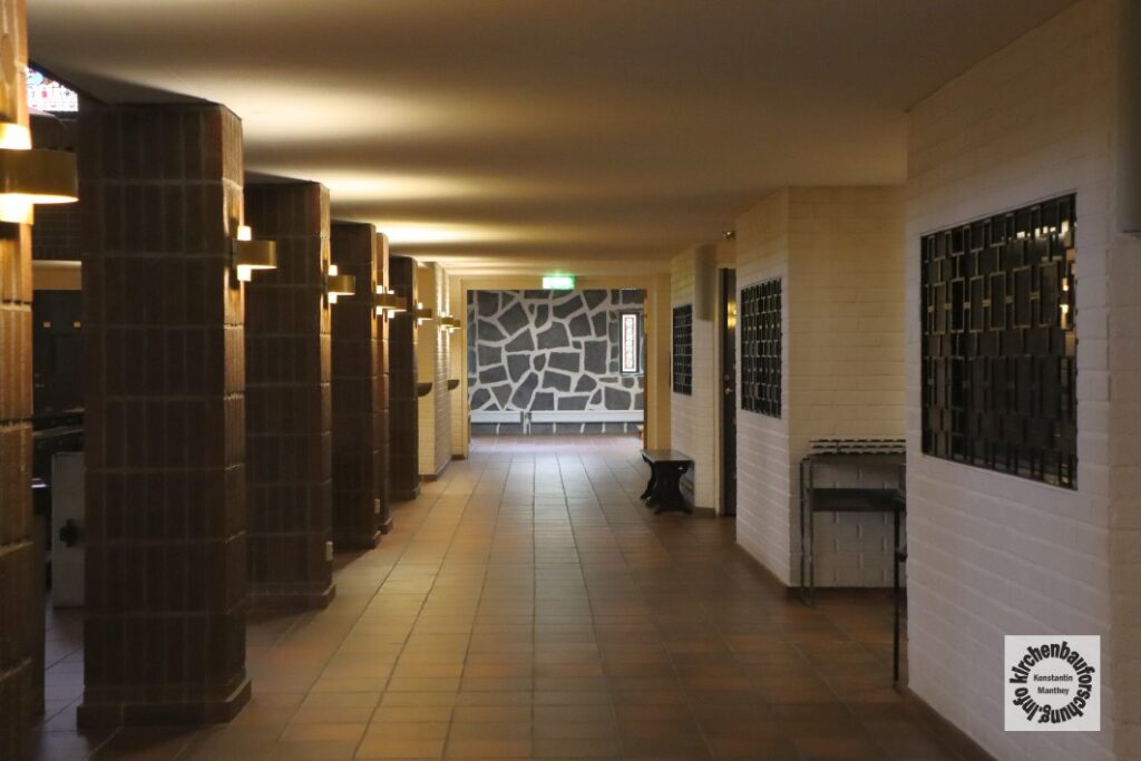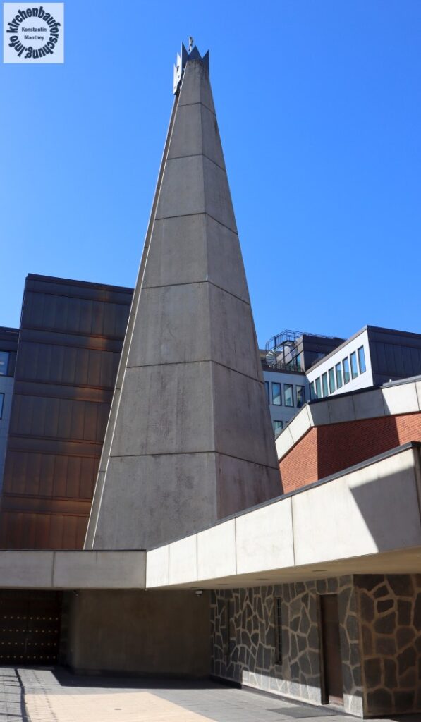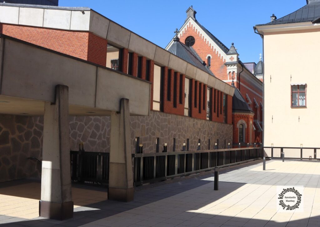 Zudem ist ein Umgang entstanden, der neben Beichtorten, Seitenkapellen und Andachtsnische erschließt. Weiterhin erhielt die Kirche nun neue Zugänge. Außerdem wurden um einen L-förmigen Innenhof weitere Gebäude errichtet. Dort befindet sich auch der 27 Meter hohe Glockenturm aus Sichtbeton. Dieser wird durch ein Kronenmotiv bekrönt. Ebenfalls lassen sich Kronen überall an den Zäunen, Gittern und Türen finden. Sicherlich sind dies Bezüge auf den Patron der der Kirche Erich IX, den heiligen König von Schweden aus dem 12. Jahrhundert, der die Ausbreitung des Christentums förderte.