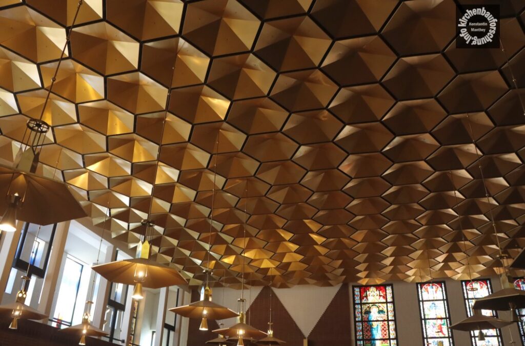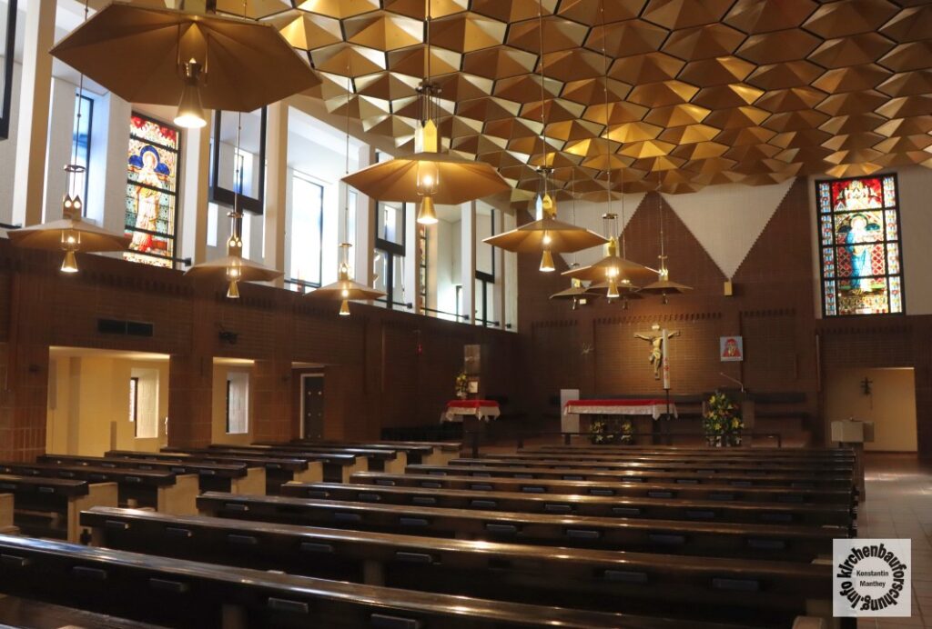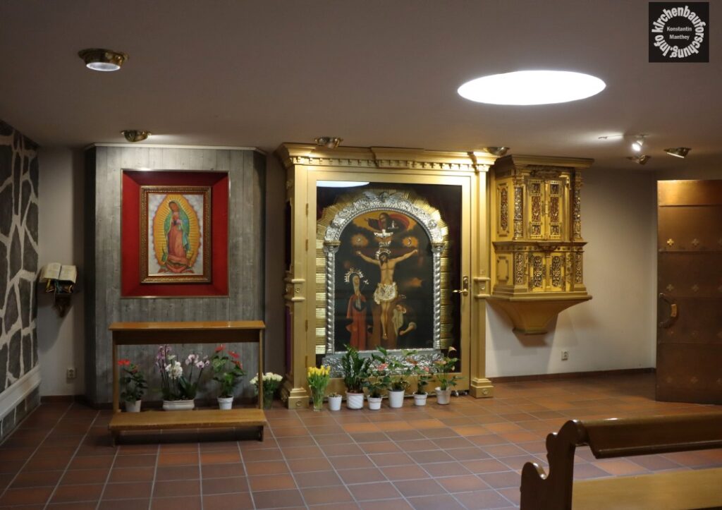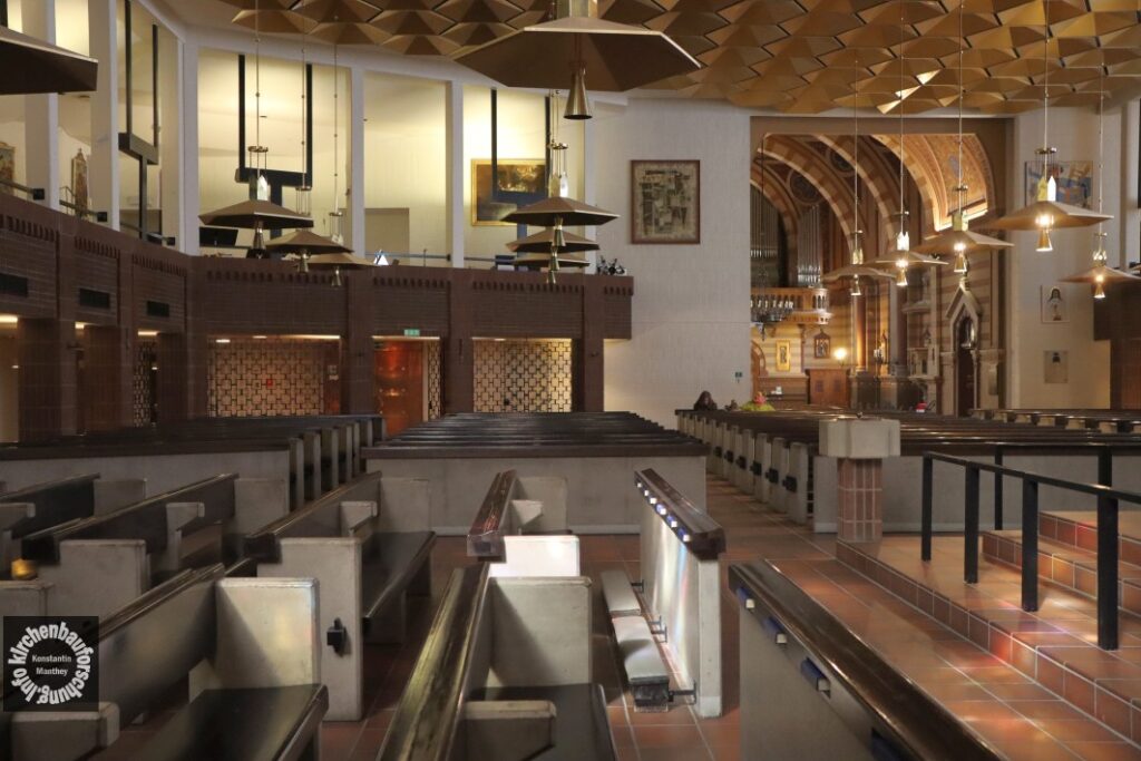 Es entstand ein bauliches Gegensatzpaar, vermutlich um nichts zu kaschieren, das nicht verdeckbar ist. Direkt hinter der alten Kirche wurde nun „ein multifunktionales Pfarr- und Diözesanzentrum“ (Art. Wikipedia) geschaffen. Der neue Hauptkirchenraum hat einen quaderförmigen Grundriss. Der Altarraum ist in eine Ecke gestellt, so dass Tabernakel und Opfertisch auch vom Eingang der ersten Kirchen zu erkennen sind. Die Ebenfalls vom Architekten entworfenen Bänke ordnen sich in mehreren Blöcken um die Hauptinsel, somit stieg die Sitzanzahl um 350 auf 600 Plätze.
